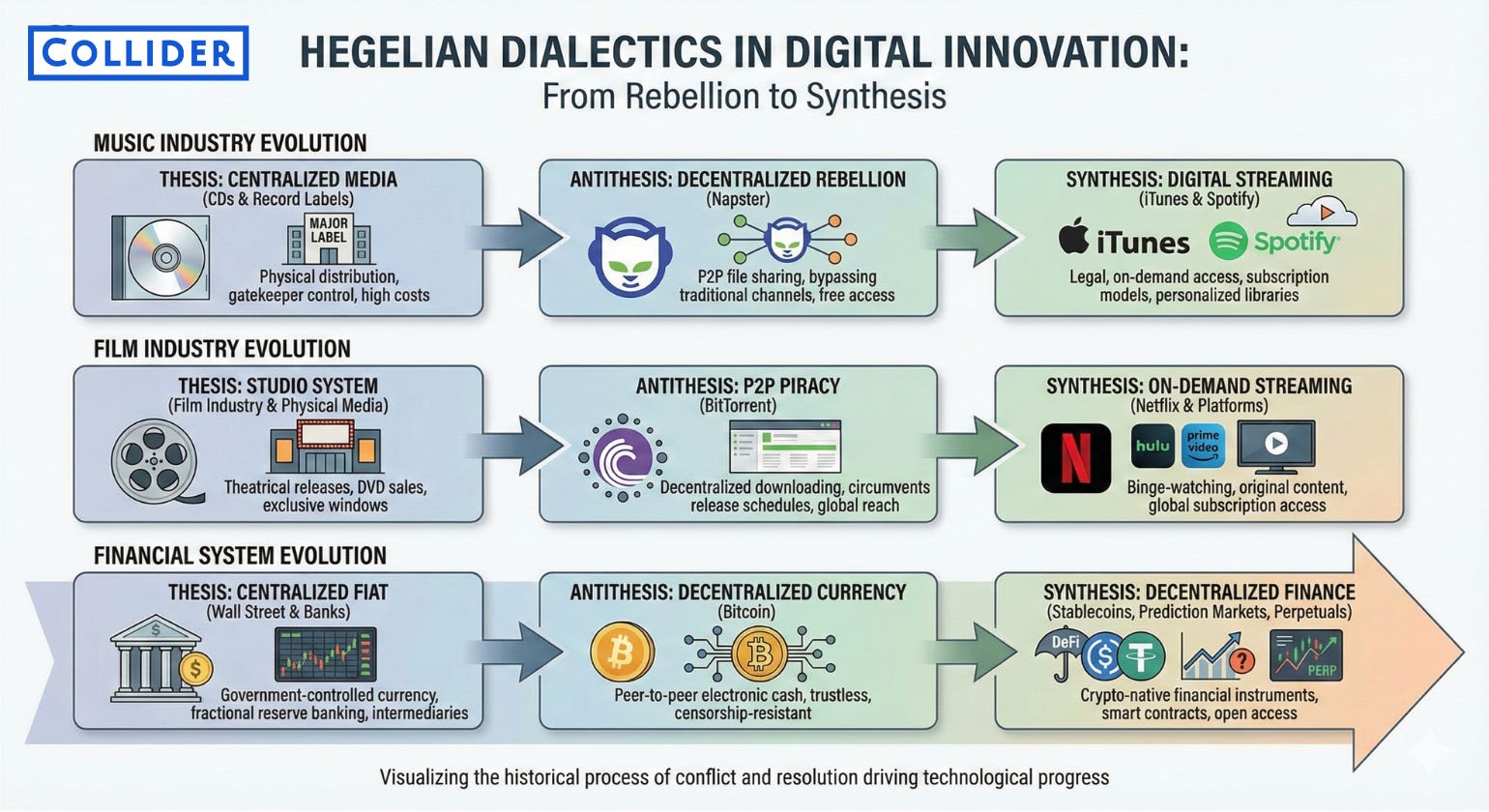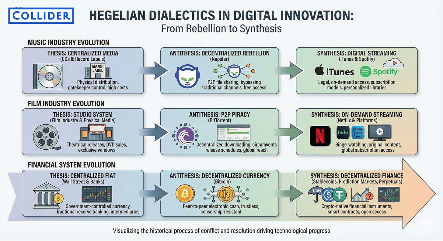 The Thesis (The Status Quo): This is the established order. It is stable, rigid, and dominant. (e.g., The Monarchy, The Record Label, The Fiat system and the Central Bank).